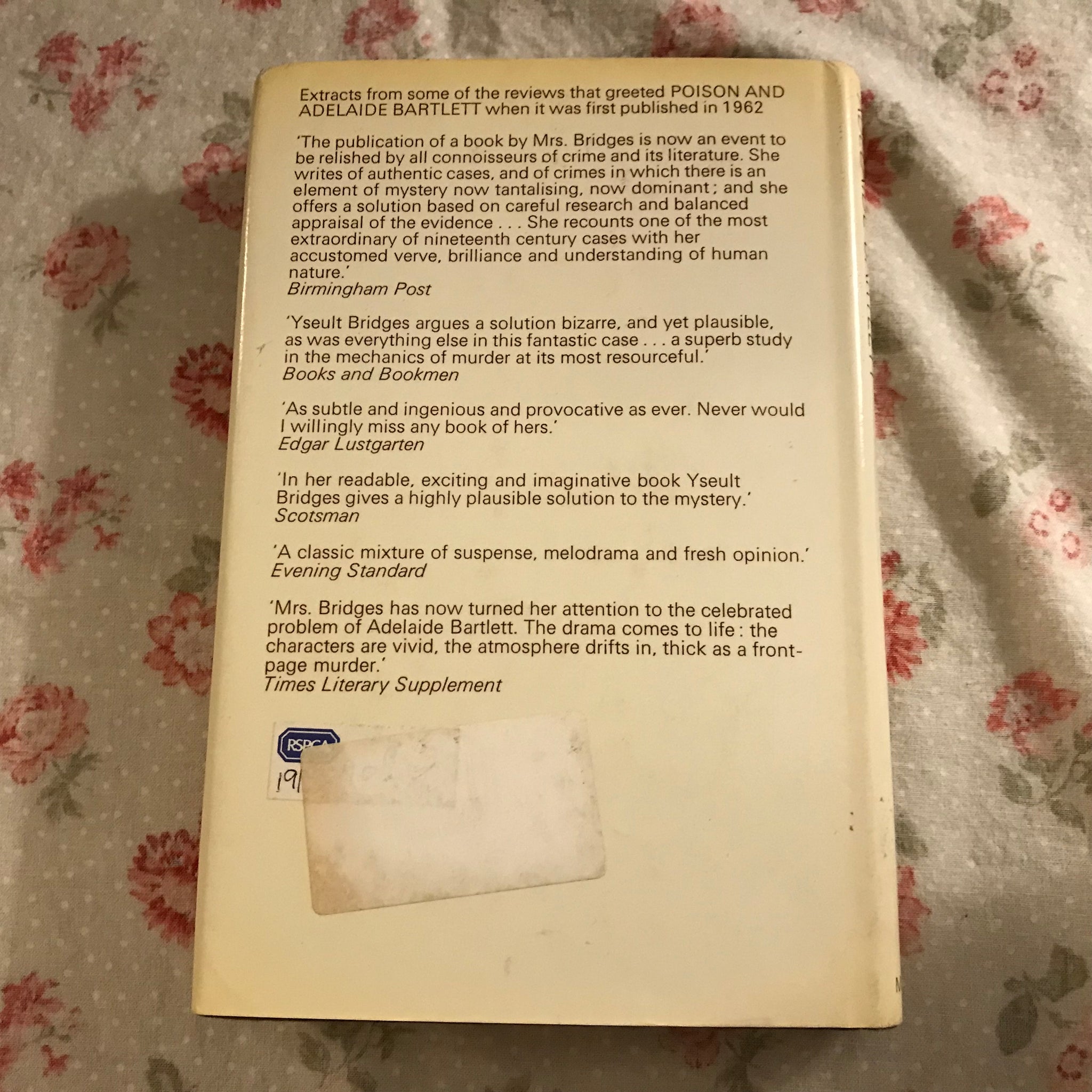 By Yseult Bridges. “A Reissue of a Celebrated Study of the Pimlico Poisoning Case — with a new Postscript.” A 1970 hardcover reissue of Bridges’s (apparently) legendary investigation of the poisoning of Edwin Bartlett by (allegedly) his wife Adelaide and her minister lover, and the trial shenanigans that followed.