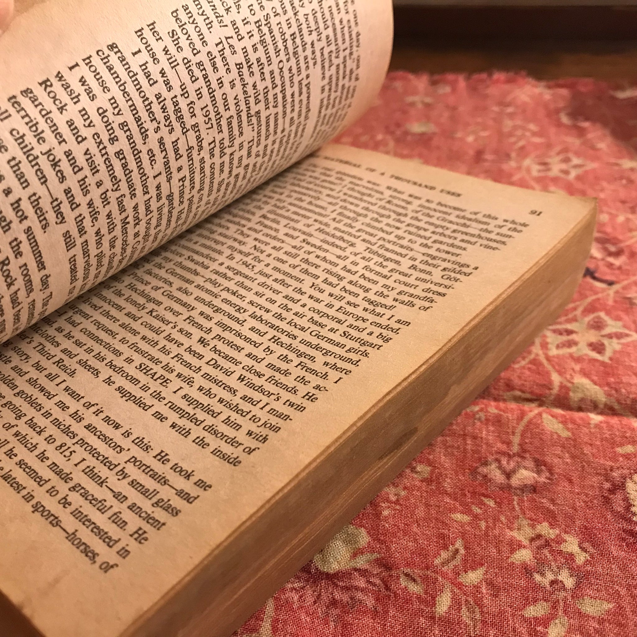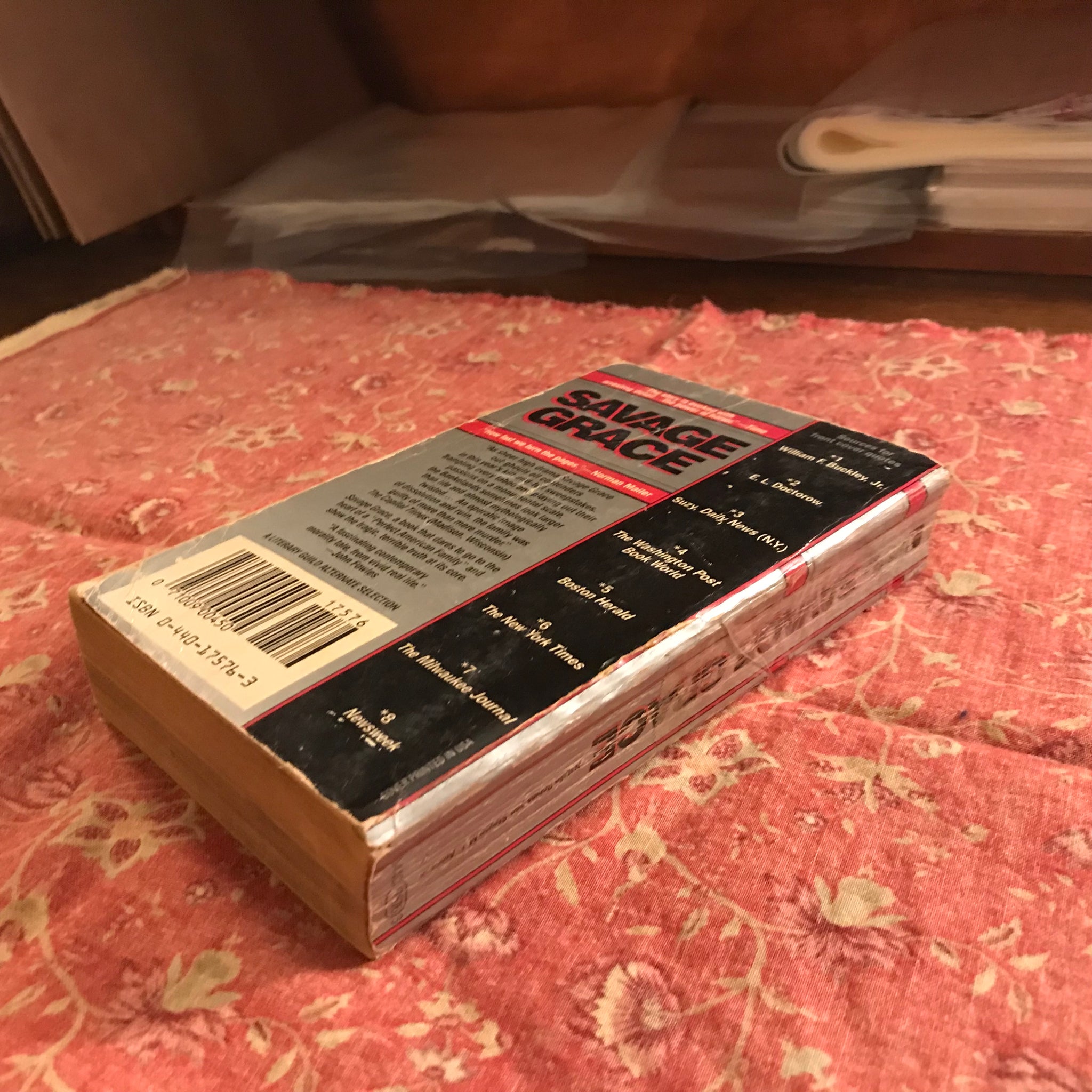 This paperback is visibly “loved hard”: advanced edgewear and creasing to covers; cracked spine repaired with duct tape; toned pages with foxing/a stain to the edges. A good price to read and recycle, though.